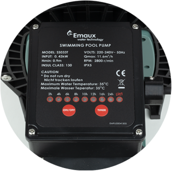 Насоси Emaux серії SS обладнані вбудованим таймером для контролю графіка циркуляції води в басейні. За замовчуванням, при підключенні насоса до мережі, Вмикається безперервна циркуляція води тривалістю 24 години.