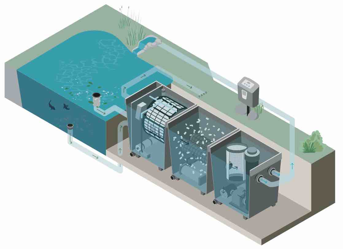 Рівень фільтруючої системи вирівнюється з рівнем поверхні у ставку. Забруднена ставкова вода через донний водозабор і скіммер потрапляє в барабанний фільтра. Далі очищена вода потрапляє в біологічний фільтр або фільтри (їх кількість залежить від зариблення або об'єму води. Насос з УФ стерилізаторами знаходиться в насосному модулі в кінці системи та перекачує очищену воду назад у ставок.
