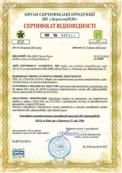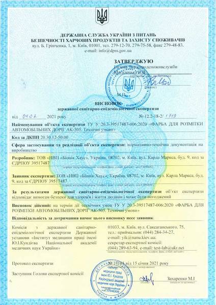 Фарба для розмітки автомобільних доріг АК-505 виробництва Bionic-House має СЕРТИФІКАТ відповідності нормативним документам та висновок державної санітарно-епідеміологічної експертизи.