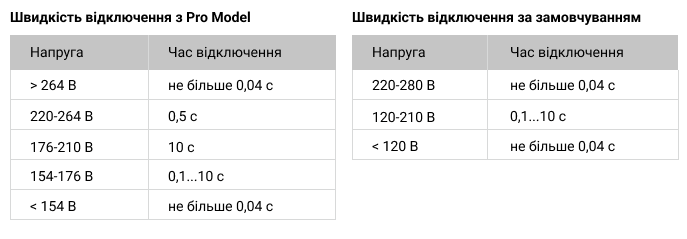 Швидкість відключення навантаження за замовчуванням, та у разі застосування Професійної моделі відключення.