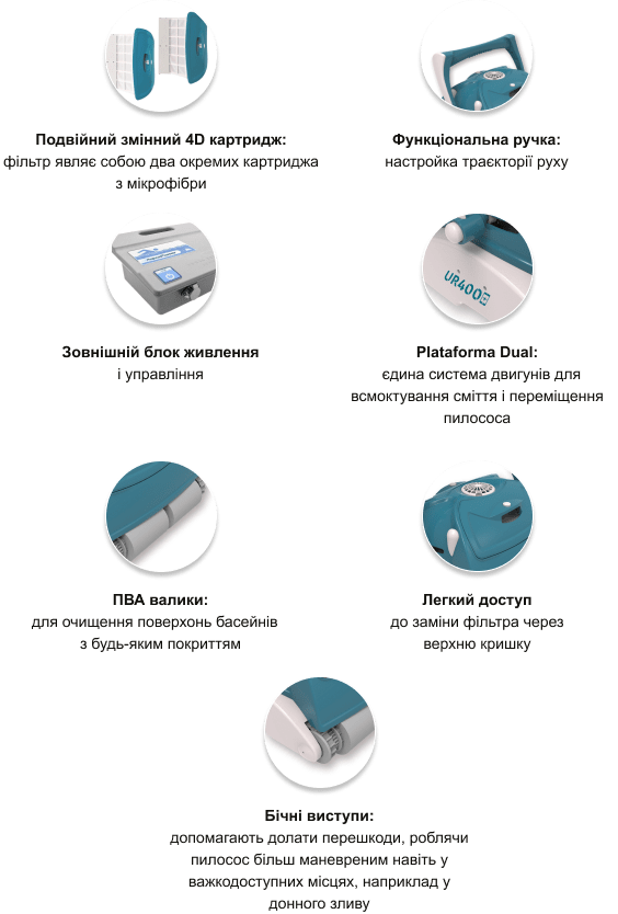 Цикл прибирання складає 90, 120 або 150 хв. Два окремих картриджі з мікрофібри очищають воду від найдрібніших забруднень завдяки системі 4D-фільтрації від 2 мкм. Пилосос обладнаний 4-ма валиками з ПВА й додатковою віброщіткою для ефективного очищення дна, стінок і ватерлінії.