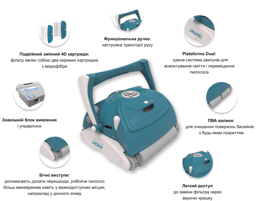 Робот-пилосос Aquabot UR400 це флагманська модель пилососів Aquabot серії UR. Ідеальне рішення для очищення приватних басейнів завдовжки до 12 м і площею до 80 м² будь-яких форм і поверхонь. Пилосос обладнаний гіроскопічною системою Gyro і навігаційним алгоритмом Aquasmart. Оснащений подвійним змінним 4-D картриджем для фільтрації води від 2 мкм. Вбудований індикатор повного фільтру та датчик холостого ходу. Швидкий і легкий доступ до фільтра з системами Тор Access і Easy Open. Дистанційне керування по Bluetooth з вашого iOS або Android смартфону.