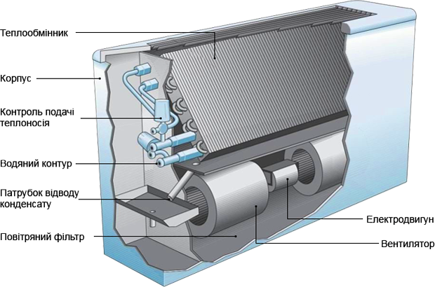 *Фанкойл вентилятор-доводчик, що завершує елемент системи кондиціювання повітря типу чиллер-фанкойл або системи опалення. Призначений для рециркуляції та охолодження повітря в приміщенні, що кондиціонується.