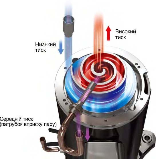 Охолодження уприскуванням пари з проміжним тиском дозволяє компресору розширити свій робочий діапазон порівняно зі звичайним компресором, забезпечуючи вищу температуру конденсації при низьких температурах кипіння.