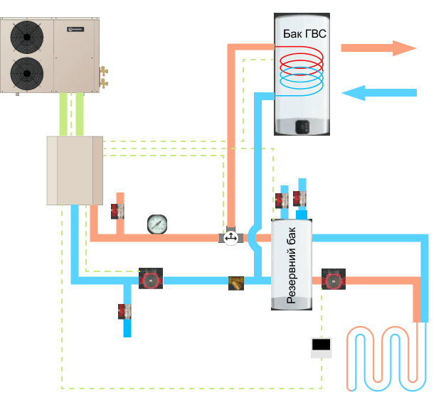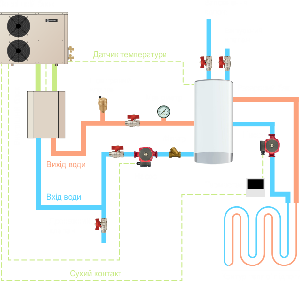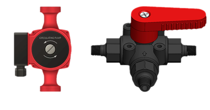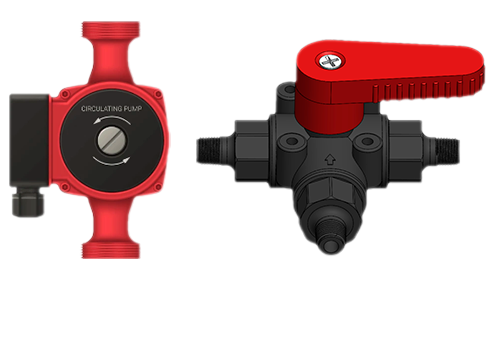 Тепловий насос обладнаний вбудованими циркуляційним насосом та триходовим клапаном. Перший забезпечує безперервний рух теплоносія в системі та підтримує циркуляцію при низьких температурах. Клапан дозволяє керувати потоками теплоносія, перемикаючись між ними, та запобігає його зворотному потоку.