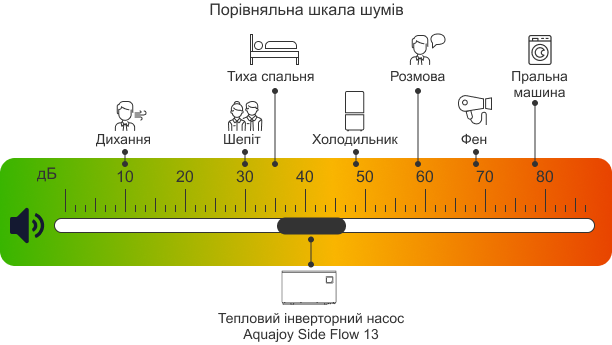 Теплові насоси Aquajoy Side Flow працюють тихо навіть за максимального навантаження завдяки безступінчастому інверторному компресору. Така система забезпечує плавне регулювання тепловіддачі та стабільну підтримку заданої температури води без різких коливань.