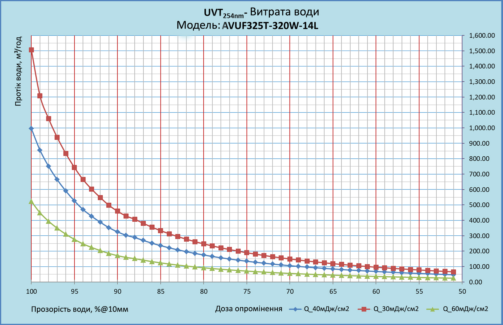 | Модель | Швидкість протоку, що забезпечує дозу опромінення 30 мДж/см², м³/год | Кількість ламп, шт. | Потужність однієї лампи, Вт | Загальна потужність, Вт |
