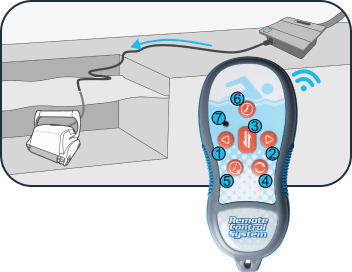 Пульт дистанційного управління подає радіосигнал на блок живлення та управління. Блок живлення та управління перетворює радіосигнал на електричний, та пилосос отримує команду через кабель.