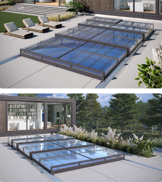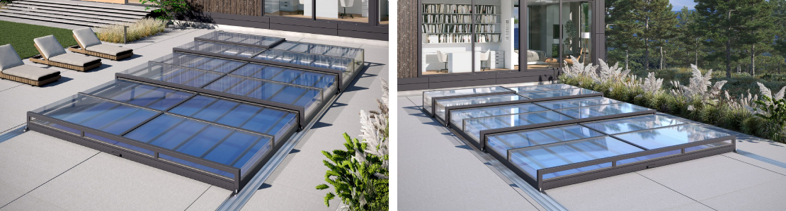 Павільйон для басейну Klever Degas це сучасне розсувне накриття, яке зберігає тепло води, захищає її від сміття й опадів та робить басейн безпечним для дітей і тварин.